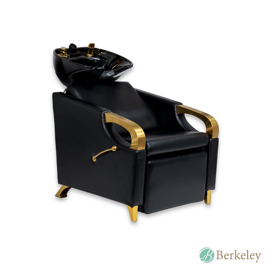 Experience ultimate comfort with Berkeley's AURUM LUXE Backwash Unit. Designed for relaxation, featuring an adjustable basin, ergonomic seating, and accented with gleaming gold fixtures, adding a lavish flair to your salon.